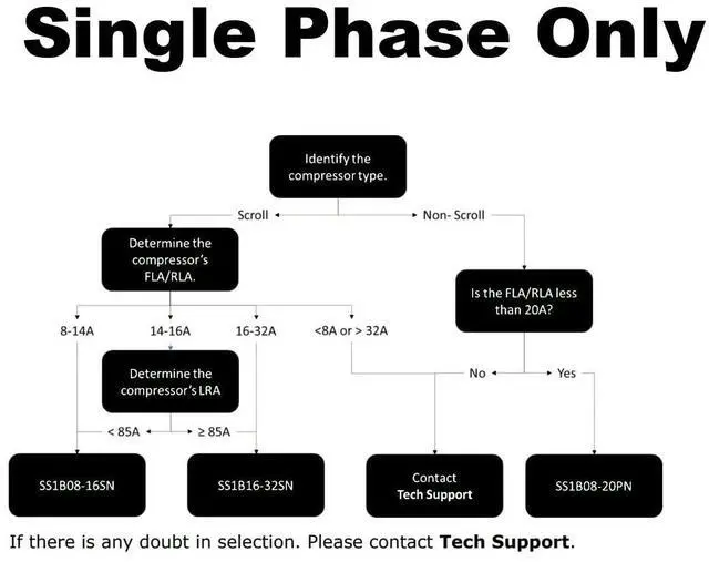 This product has been developed specifically to soft start large single phase compressors and motors. It provides a dramatic reduction in the starting current but still provides full start torque. Please consult the FLOW CHART image for help selecting the correct unit.