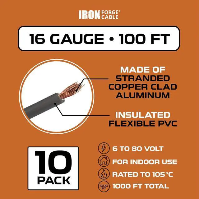 Handles Extreme Heat - Rated to 105°C. 100 feet of 16g wire per roll. Stranded copper clad aluminum. The 16 gauge wire automotive has 0.2 mm dia/strand, 36 strands. Do not use this 16 awg wire for building/household 110 / 220 V AC wiring.