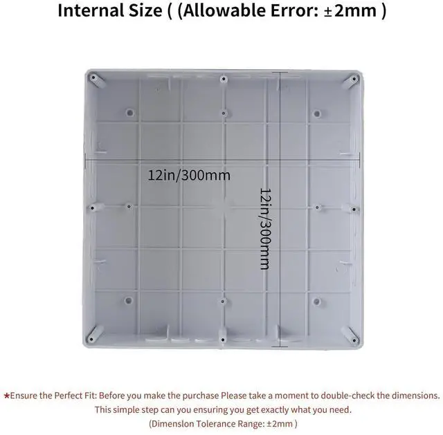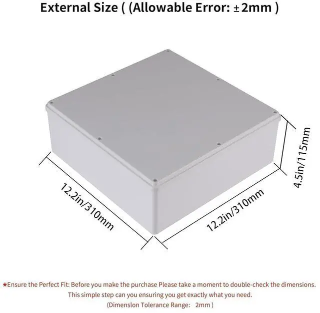 IP65 Waterproof RatingOur Waterproof junction box is made of high-quality PVC plastic, which is very lightweight, heat-resistant, wear-resistant, corrosion-resistant, not prone to fading, durable and sturdy,effectively block splashing water, rain, dust, snow, oil, UV, etc., can be widely used for both indoor and outdoor applications. Junction Box SizeThe width of the electrical boxes is 12 inches, the length is 12