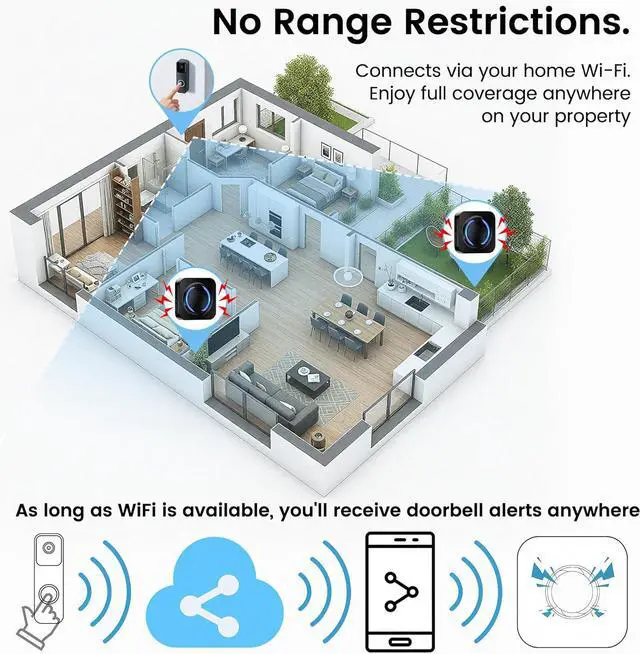 Wi-Fi Extended Coverage Receive alerts anywhere your Wi-Fi reaches. Unlike traditional wired chimes, this wireless doorbell extender transmits signals through the cloud, ensuring stable performance across rooms, basements, or large houses.