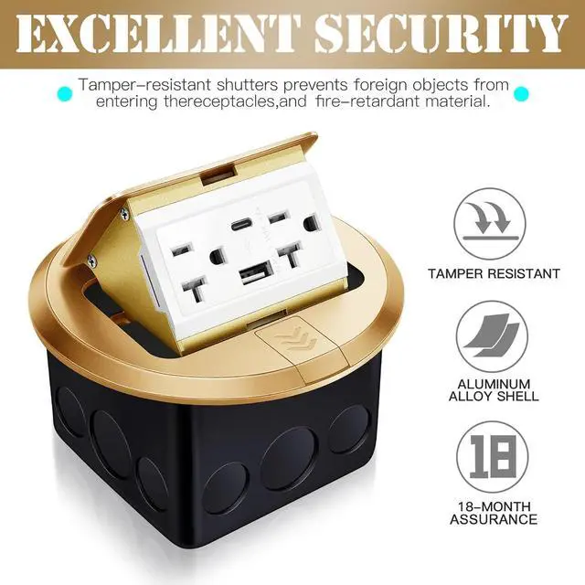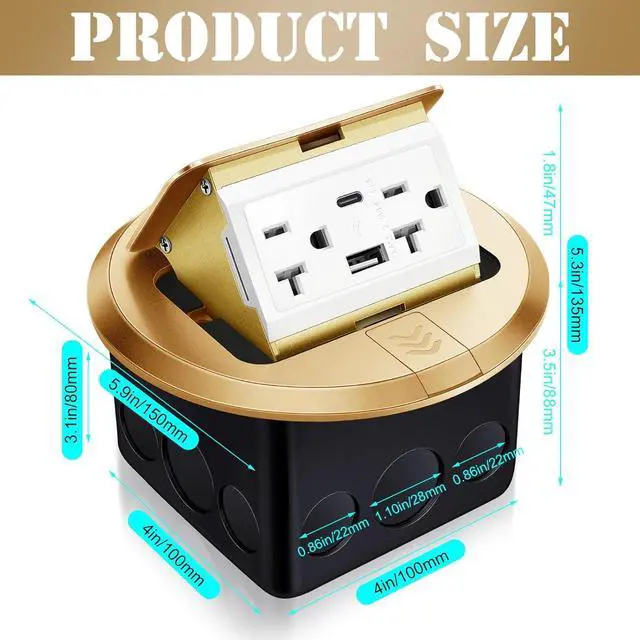• Size Information: the electric outlet box measures 4" x 4" x 3.5"/ 10 x 10 x 8.9 cm, the size of the round metal above the ground is 5.9" x 5.9" / 15 x 15 cm, the height of the socket up state is 1.8" /4.7 cm, and the package comes with 1 pack of electrical outlet boxes with sealing washers, mounting screws and junction boxes, and outlet boxes have 2 20A tamper resistant receptacles, 1 4.8A USB charging ports and 1 typeC charging ports