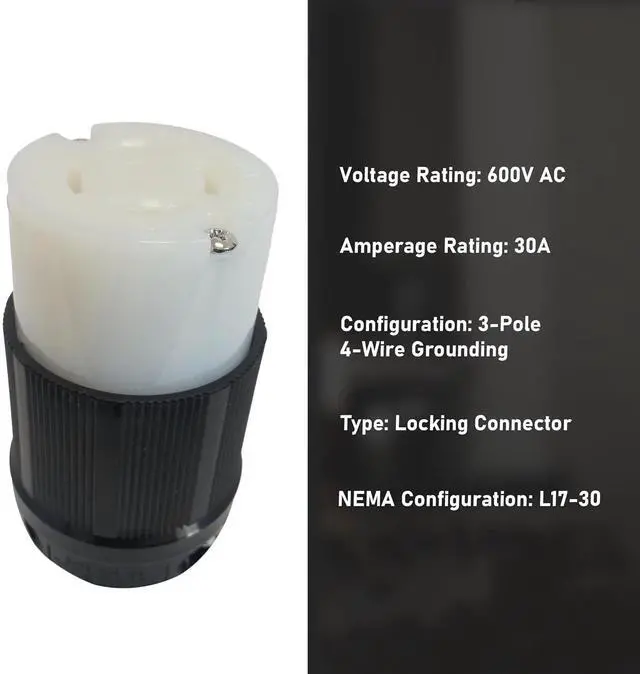 Industrial grade grounding connector with 3 poles and 4 wires Nema designation, amperage, voltage and certification molded on face of device 30 amps 600 volts ac Heavy duty construction Cul listed