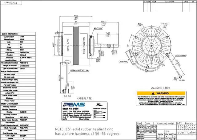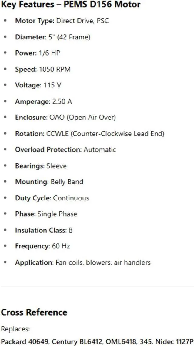D156, PEMS Direct Drive Motor, PSC, 5" Dia, 1/6Hp, 1050 RPM, 115 V, Fr:42, ODP,