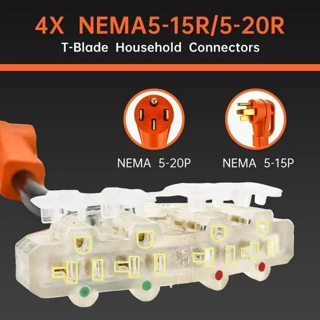 Safe Power Distribution: Features a NEMA TT-30P male plug and three 5-15R/5-20R T-blade female outlets for distributing power safely.