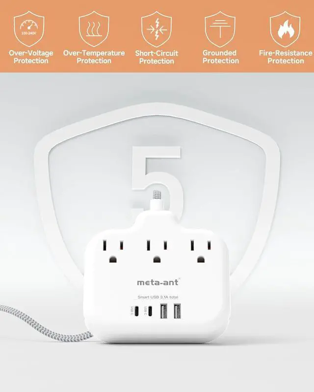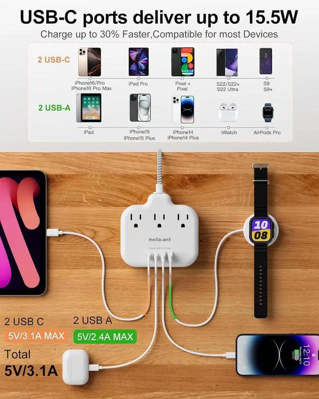 4 USB Charging StationMulti outlet splitter has 2 USB-A & 2 USB-C fast charging ports. The smart charging technology helps detect the device and deliver a maximum power of up to 3A/15W. Compatible with most of iOS, Android devices.