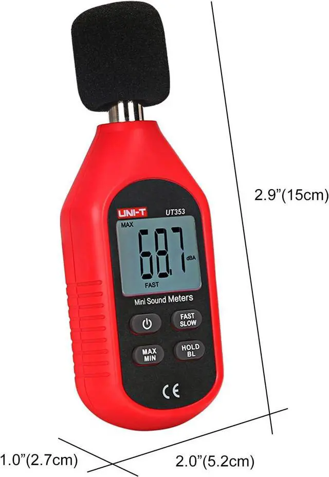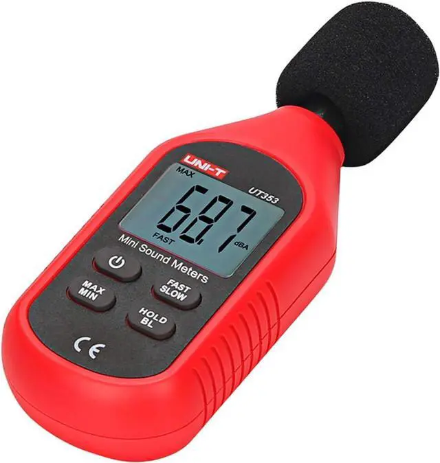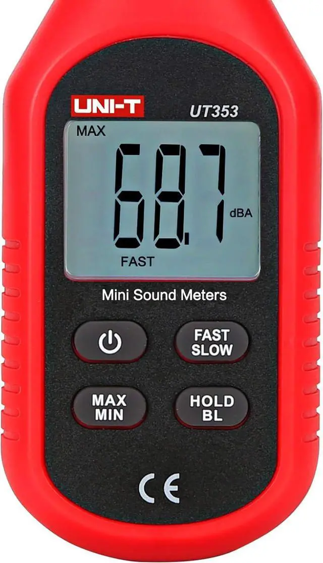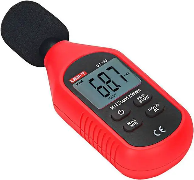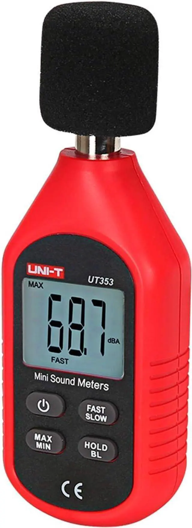 UNI-T decibel meter sound level reader UT353. Measures from 30dBA to 130dBA. +/- 1.5dBA with 0.1dBA resolution. User-friendly interface. White backlit and clear LCD screen for easy visibility in dark situations.