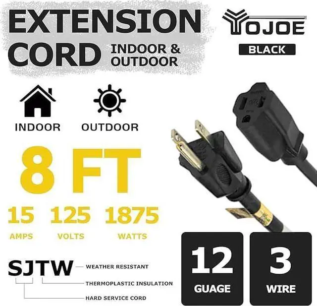 PRODUCT SPECIFICATIONS: This Black 8 ft extension cord features 12-gauge wiring, a 3-prong grounded plug, supports up to 15 amps, 125 volts, and 1875 watts. Tmperature Range of -40°F to +140°F.
