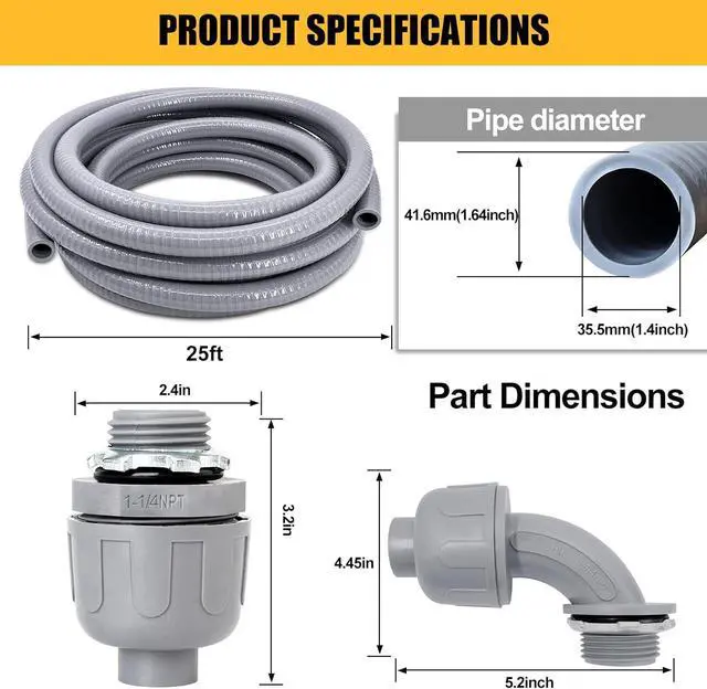 High-Quality Liquid-Tight Conduit: Our liquid-tight conduits are made of premium PVC material, featuring a smooth interior for easier wire pulling. 50% lighter than metal conduits, more flexible and lightweight, and lower installation costs. Length: 25 feet, Inner diameter: 1.4 inch, Outer diameter: 1.64 inches. Comes with 4 straight and 2 90-degree conduit connectors.