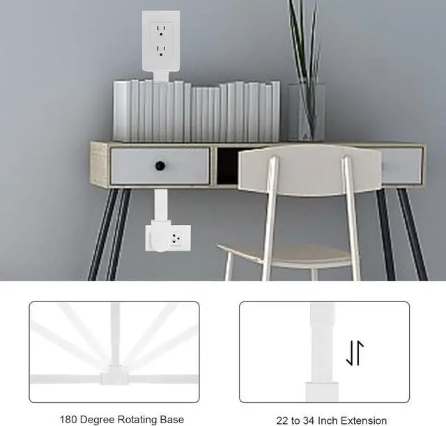 Flexible Extension Rotation: This power strip can extend from 22 inch to 34 inch, with a 180 degree rotatable base, allowing placement in vertical, horizontal, or any position between, providing flexibility