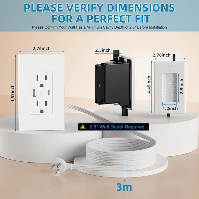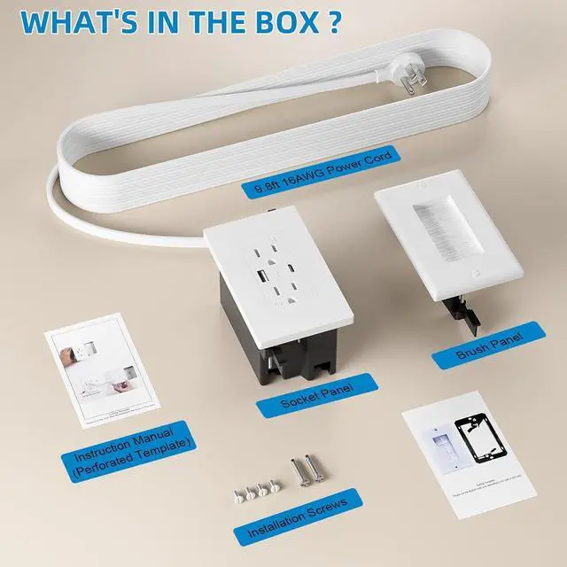 Effortless DIY Upgrade in Under 30 MinutesThe all-inclusive kit comes with pre-assembled components. Simply install the brush plate and outlet panel by creating two holes, and enjoy your upgraded space in no time. What's in the box: 1* 2AC Socket panelr; 1* Brush panel; 1 * 9.8ft 16AWG power cord; 1* Instruction manual (perforated template).