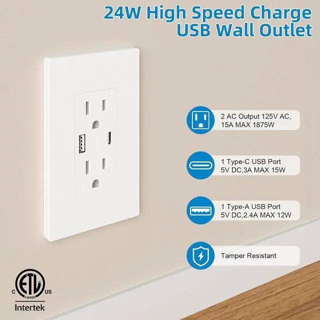 Power and Charge All Your Essentials at OnceThis station includes 2 standard AC outlets (125V, 15A, 1875W Max), plus a USB-A (5V/2.4A) and a USB-C (5V/3A) port. Simultaneously charge your phone, tablet, and laptop without competing for adapters. (Total USB output: 4.8A Max).
