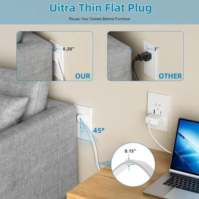 Space-Saving 45° Plug & In-Wall Flat WireEngineered for a professional installation. The low-profile 45° plug prevents blocking the adjacent outlet. The accompanying slim 7mm flat wire is specifically designed for in-wall use, making it easier to route behind drywall and contributing to a cleaner finish.
