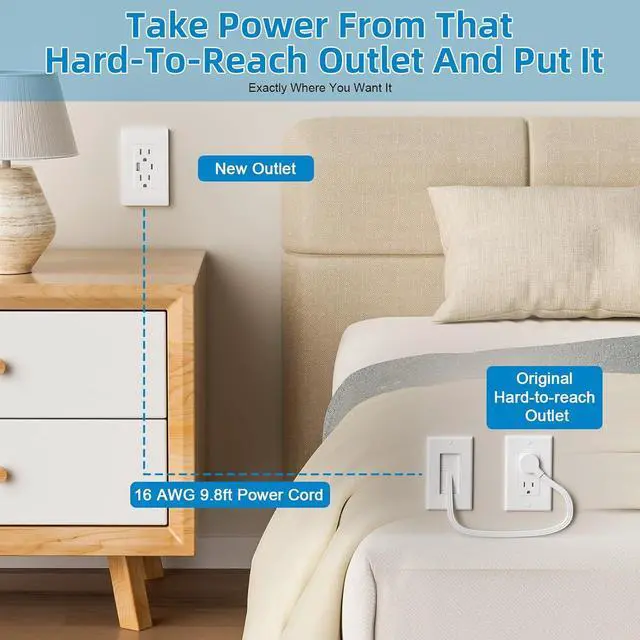 Stop Stretching and Straining to Use Blocked Outlets This in wall cable management kit relocates power from behind obstructions to your most desired spotslike behind nightstands, kitchen counters, or office desks. The 9.8-foot cord offers the perfect reach for a cleaner, more accessible power solution.