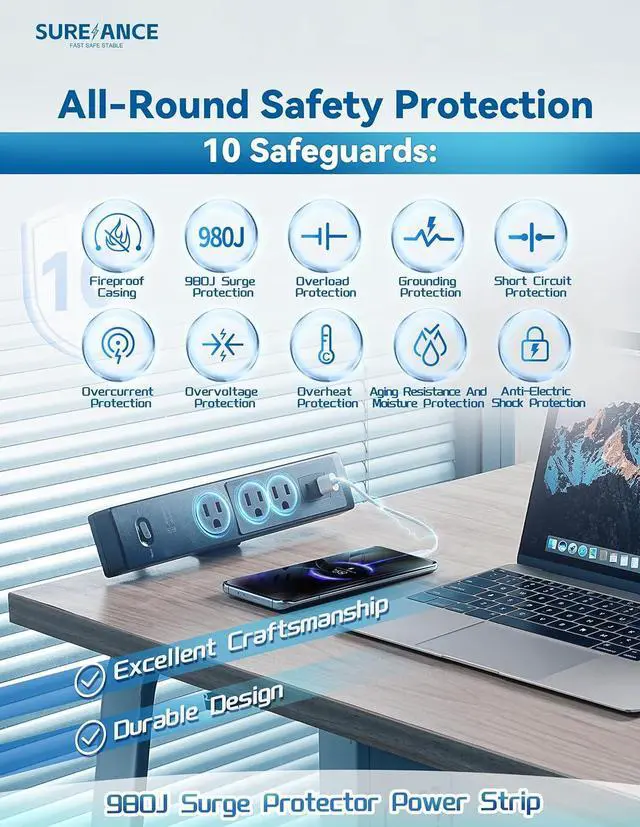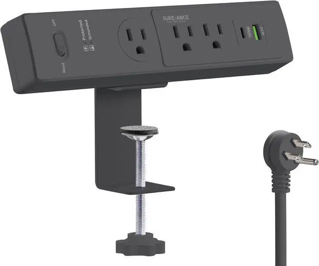 10 Safeguards Desk Clamp Power StripThe edge mount power strip features a fireproof casing,overload protection, grounding protection, short-circuit protection, overcurrent protection, overvoltage protection, overheating protection, aging/moisture resistance, and anti-electric shock protection. 980J surge protection (3X industry standard) guards your $3,000+ tech gear against lightning strikes and power spikes