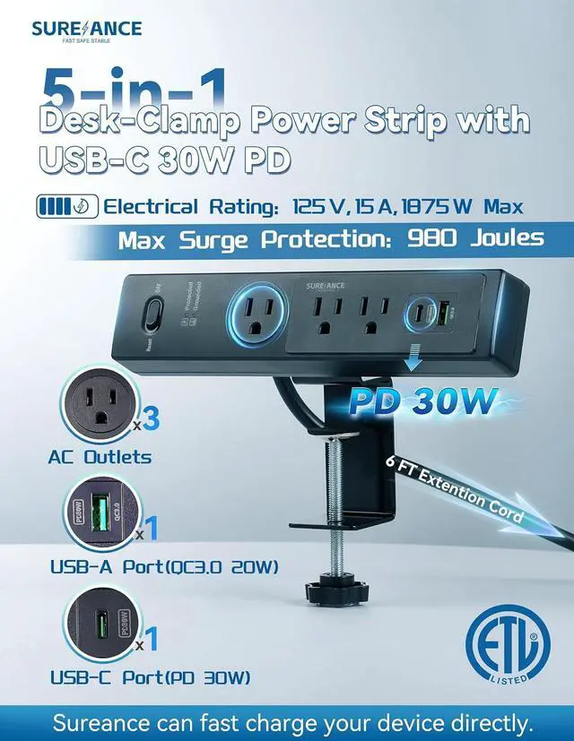 Charge 5 Devices Simultaneously Surge Protector Outlet ExtenderThis desk clamp power strip usb is equipped with 3 AC outlets and 2 USB ports (1 PD 30W USB-C / 1 QC 3.0 20W USB-A) to power laptops, phones, lamps, monitors - all from one central hub. It also features a built-in grounding protection indicator and surge protection indicator