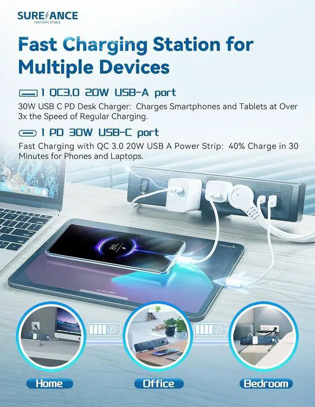 PD 30W USB-C / 1 QC3.0 20W USB-A D Fast Charging Station1 PD 30W USB-C port that fast charges smartphones and tablets at over 3x the speed of regular charging, and a QC 3.0 20W USB-A port that can charge phones to about 40% in just 30 minutes, and can also fast charge laptops ect