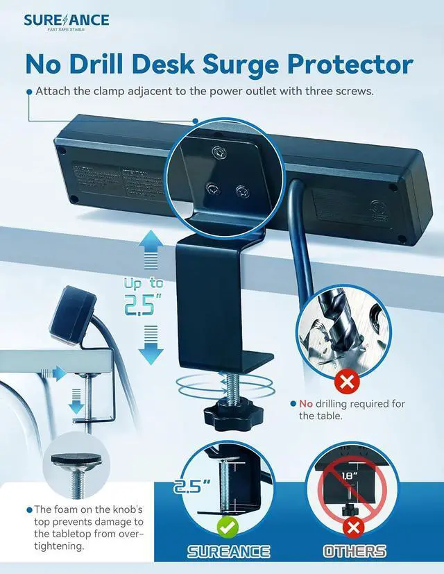 Tool-Free Installation in 10 Sec Power Strip Surge ProtectorNo drilling, no adhesives, no hassle. The industrial-grade desk clamp installs tighter than most monitor arms with simple hand-tightening. Need to relocate? Just unclamp and reattach - ideal for co-working spaces, dorm rooms, or temporary workstations