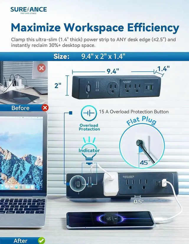Maximize Workspace Efficiency Desk Clamp Power Strip USB CClamp this ultra-slim desk clamp power strip to ANY desk edge (2.5" power strip desk holder) and instantly reclaim 30%+ desktop space. The 15°angled outlets & 6ft desk extension cord eliminate awkward plug bending, while non-slip rubber pads protect your $1000+ desk finish. Perfect solution for cramped home offices or multi-monitor setups