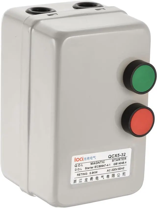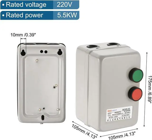 Rated Voltage: 220V; Rated Power: 5.5KW; Starter Rating: 7.5HP; Size: 175x105x105mm/6.89x4.13x4.13-inch (L*W*H); Hole Dia: 10mm/0.39-inch; Hole Distance: 76mm/2.99-inch; Style: Front Button; In the package of: 1 Pcs x Magnetic Electric Motor Starter