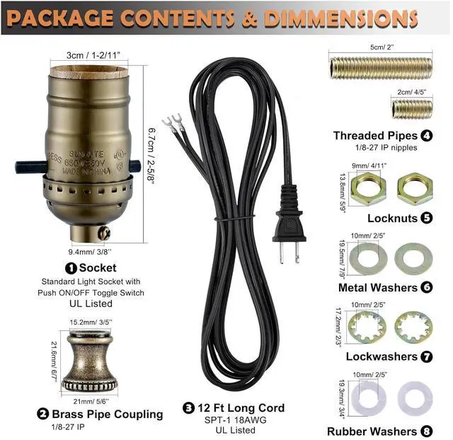 UPGRADED LAMP PARTS IN COMPLETE LAMP SET - The kit includes a Push ON/OFF Socket,a 12ft cord,4 kinds of washers and hex nuts, 1 brass pipe coupling, and 2 nipples -2.5" ,0.8" for your different assembly needs. Different essential parts to rewire or make a lamp.