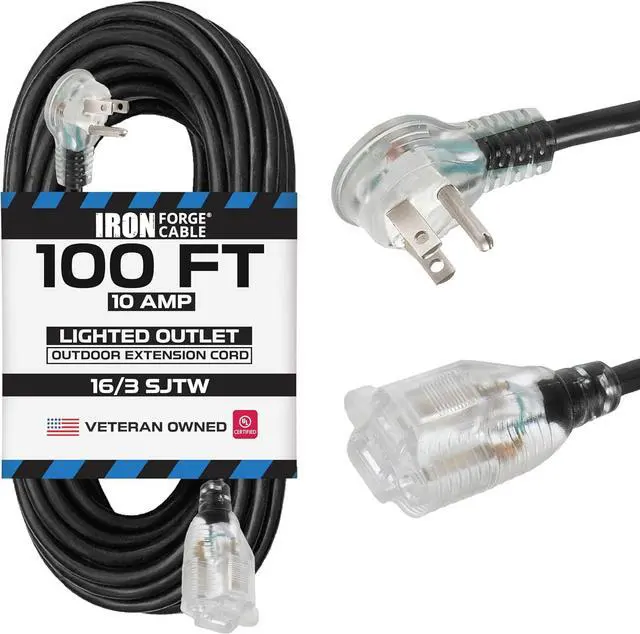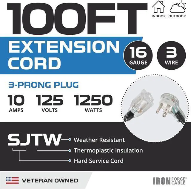 UL CERTIFIED: This heavy-duty black 100 ft extension cord for outside is UL certified. 16 AWG/16 gauge extension cord black, 10 amp, 125 volt, 1250 watt. Temperature rating -40°F to +140°F.