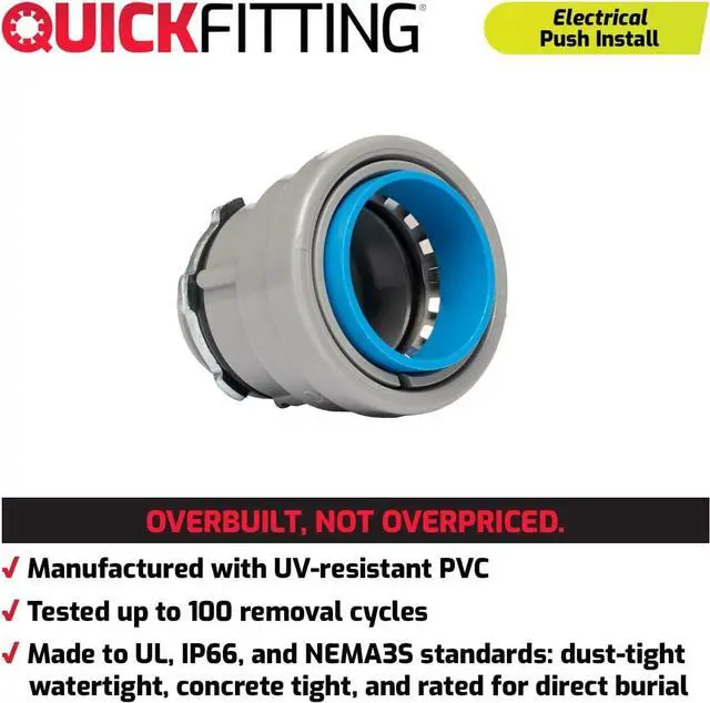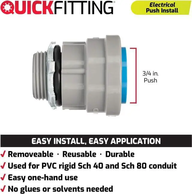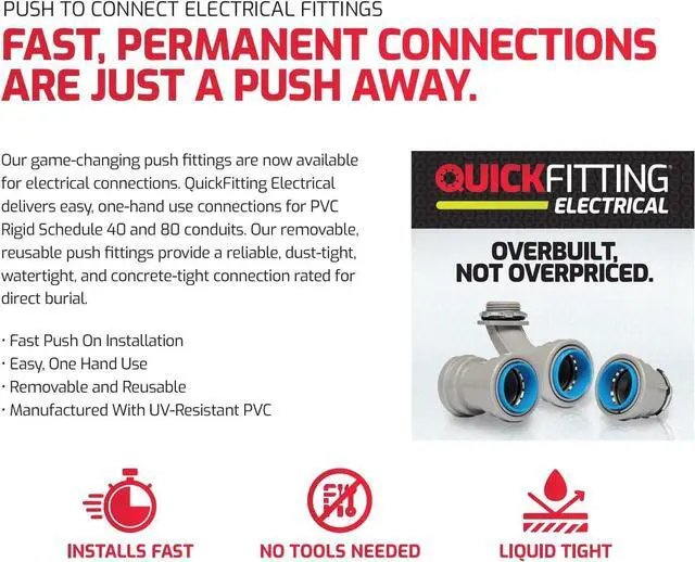 PUSH INSTALL JUNCTION BOX CONNECTOR; QuickFitting Electrical connectors are designed with ease of use in mind; they deliver fast, clean, and easy, one-hand connections for PVC Rigid Schedule 40 and 80 conduits backed by our 5-year warranty