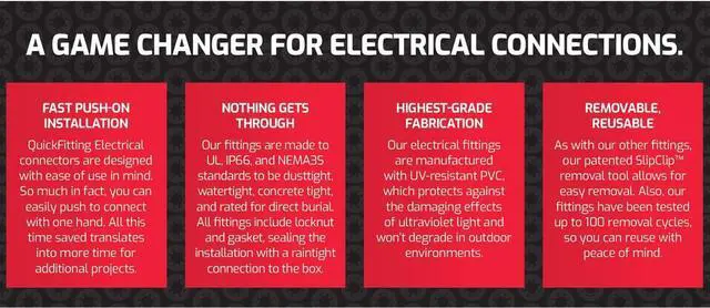 WHY CHOOSE QUICKFITTING; QuickFitting Electrical push install technology features a secure connection, all while giving the user full control through our patented Slip Clip release tool; Our electrical fittings are reusable, durable, and a long-lasting solution