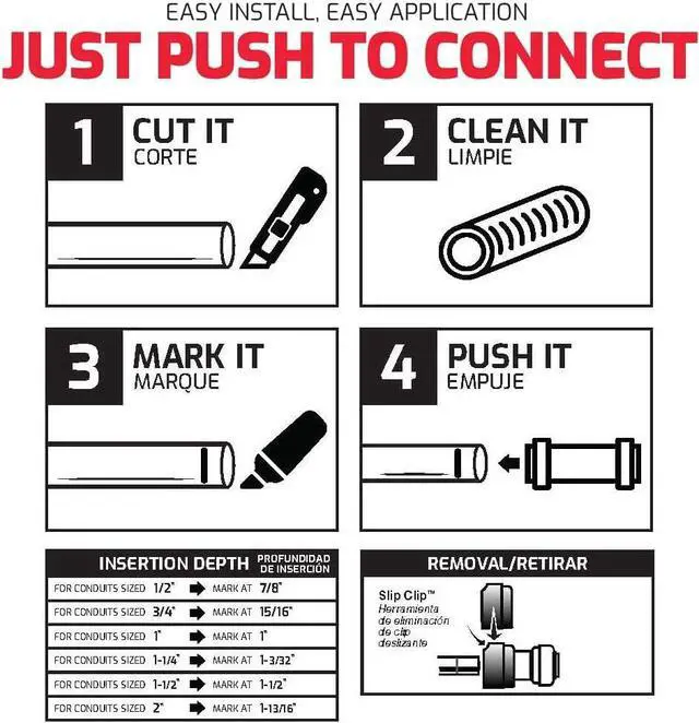 EASY and FAST INSTALLATION; Simply Simply CUT and CLEAN the end of the conduit, MARK the insertion depth and PUSH on the fitting into place; No glue, solvents or tools needed
