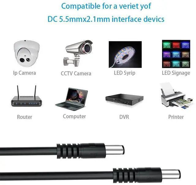 This security camera power cable cord is ideal for LED light strip, rigit strip, LED signage, and CCTV security camera, Ip camera, DVR Standalone, Audio camera,car, boat, monitors, lighting,printers, sensors, DVR, external hard drives,audio mixing and recording equipment, or anything that requires DC input and accept 12V 2.1mm x 5.5mm plug.