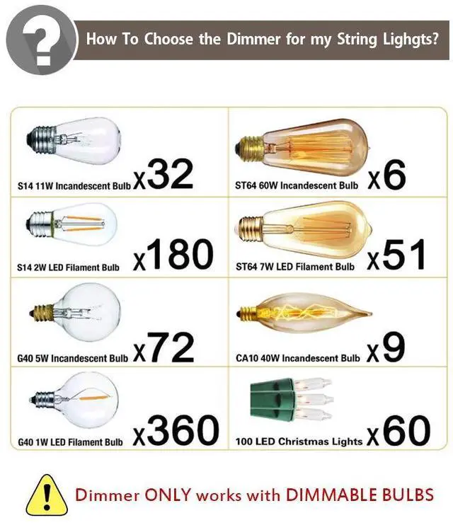 Maximum Output 360 Watts: 1) TOP IMPORTANT: Please DO NOT exceed MAXIMUM power output 360 watts for the total power of all connected string lights bulbs while using this outdoor dimmer. 2) Please make sure the string lights bulbs are dimmable before use the dimmer switch.