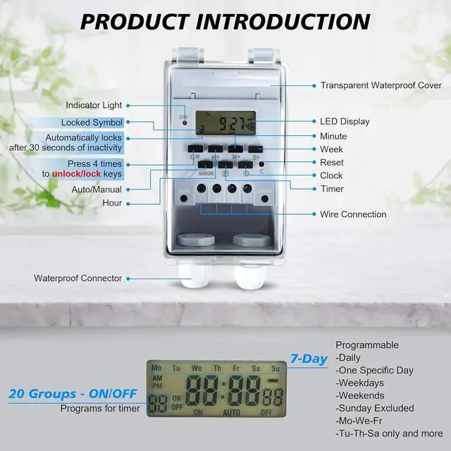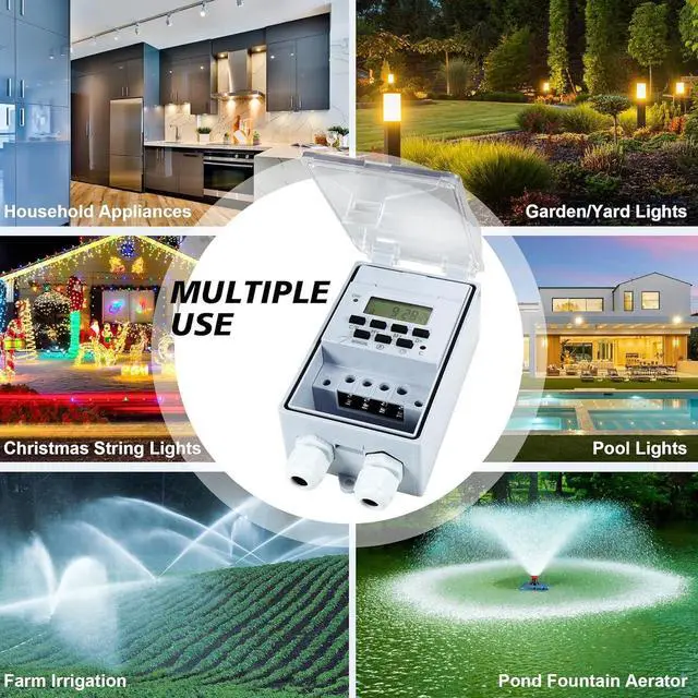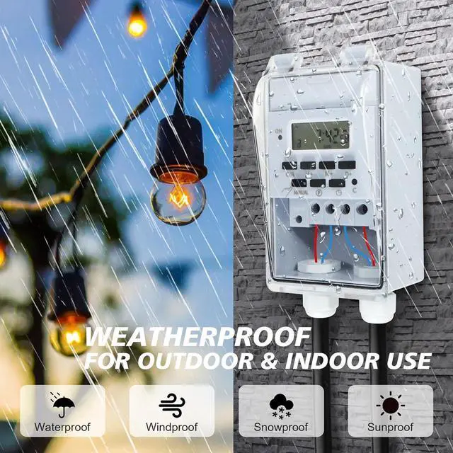 OUTDOOR&INDOOR USE: Transparent Waterproof Cover and Heavy duty material provide protecting timer from weather conditions. -Can connect indoor and outdoor electrical appliances to provide timed power, makes them safe and durable