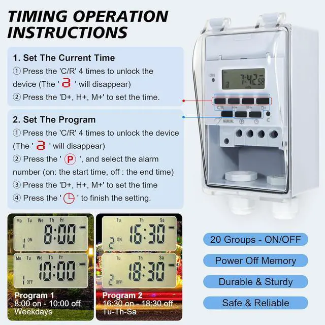 VERSATILE & CUSTOMIZABLE: The digital timer switch offers up to 20 individual schedules to turn on/off electronics automatically. The 7-Day programmable timer switch & 24-hour cycle controlalso provides up to more choices for week setting. Save energy & money