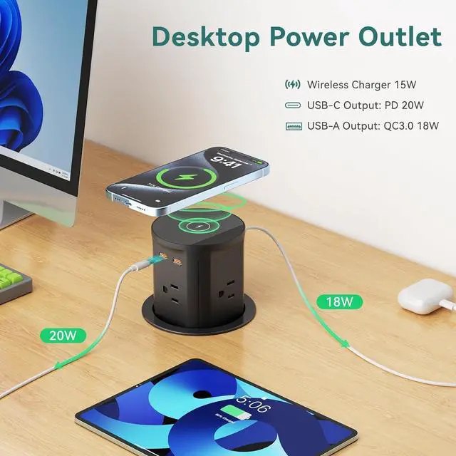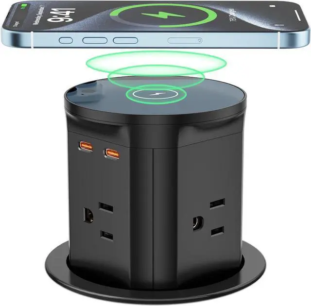 8-IN-1 Pop Up Countertop OutletOur four-sided pop-up outlet features a 15W wireless charger, 4 outlets, 2 PD 20W USB-C ports, and 1 QC3.0 USB-A port. Comes with a 6FT 16AWG power cord. This power grommet allows for quick access to multiple power sources simultaneously, making it an ideal solution for homes, kitchens, offices, and conference rooms.