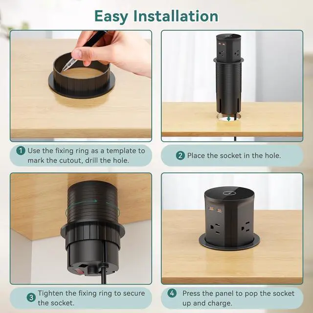 Easy To InstallCut a 3.35 inch (85mm) hole on the table, remove the ring and slide the socket body from the top, tighten up the ring from the bottom. Easy to set up in granite countertop, kitchen island, office, conference room and so on. Please note there must be a 7 inch space under the table.