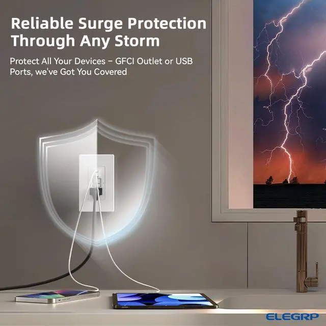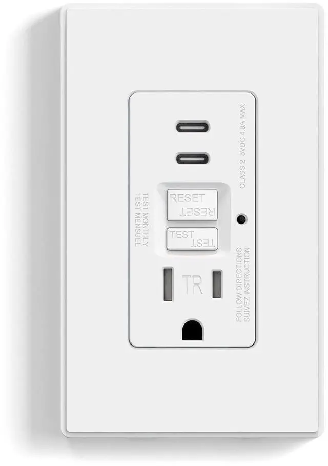 GFCI Outlet + USB Ports for Convenient Charging Combining GFCI protection with dual USB ports, this outlet delivers a total of 24W, making it the perfect solution for kitchens, bathrooms, and tight spaces. With one AC outlet and two USB ports, our "Less is More" design reduces clutter and interference from multiple connections.
