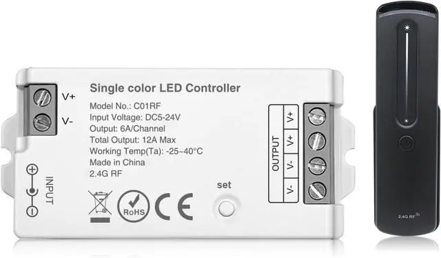 Single LED Strip ControllerDesigned specifically for standard single-color LED strips ,easily adjust light brightness. Please Note: This controller is NOT compatible with addressable SPI LED strips integrated with ICs like WS2811, WS2812B, SK6812, etc