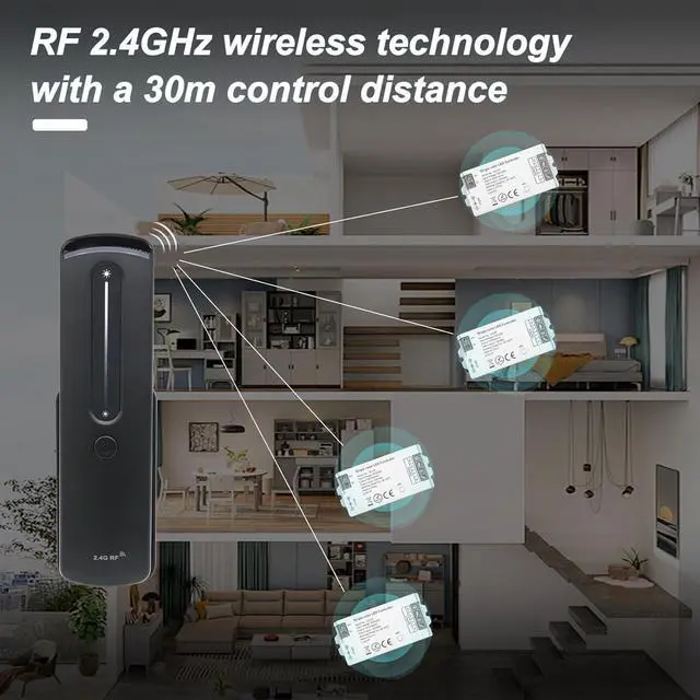Group Control and Unlimited Expansion A single remote effortlessly manages multiple independent lighting zones, as long as remain within 98 feet (approx. 30 meters). Each controller supports up to five remotes. Signals automatically synchronize, enabling both zone-specific control and centralized management of whole-home lighting