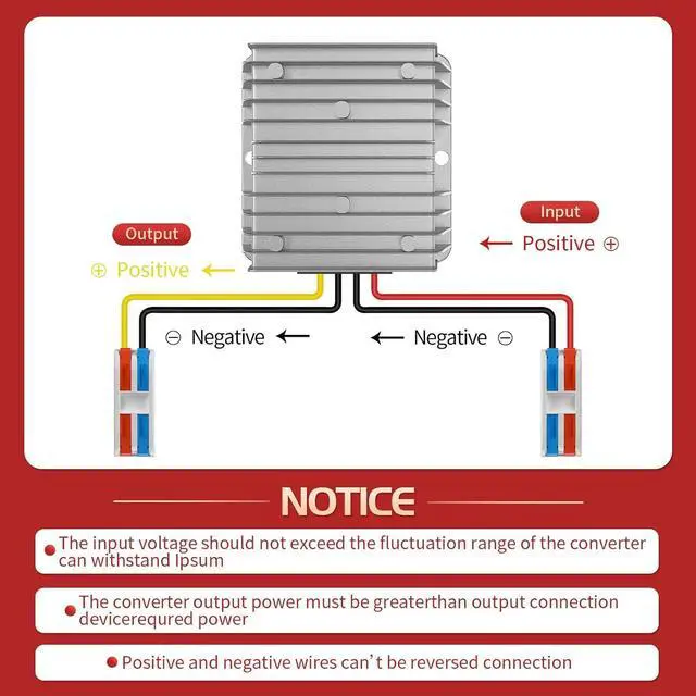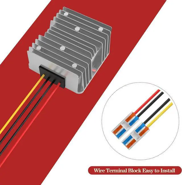 [Wire Terminal Block Easy to Install] This buck converter 24v to 12v comes with quick release terminals which is very easy to install. The 24V to 12V converter is equipped with quick cable connectors for quick connection. You can save a lot of trouble without taping wires. Note: strip the wire 0.4" (10mm or so) and insert it into the connector.