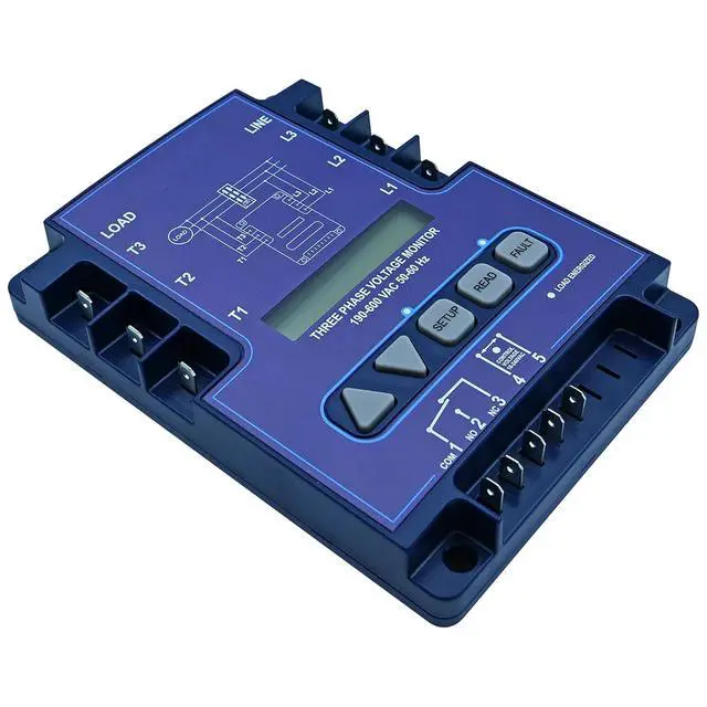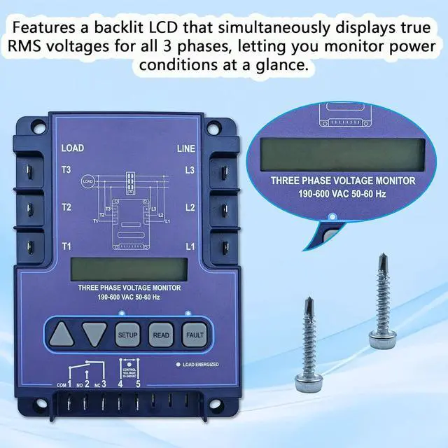 Clear Backlit LCD Display for Easy Reading Features a bright, backlit LCD screen that clearly shows the true RMS voltage for all three phases simultaneously. Monitor motor pumps, compressors, and other critical equipment at a glance, even in low-light environments.