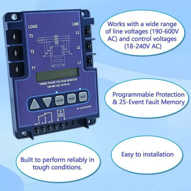 Programmable Protection & 25-Event Fault Memory Protect your machinery from damage due to voltage faults. This monitor is programmable for over-voltage, under-voltage, phase loss, and phase reversal. The 25-event fault log helps you quickly diagnose and troubleshoot past issues, minimizing downtime.