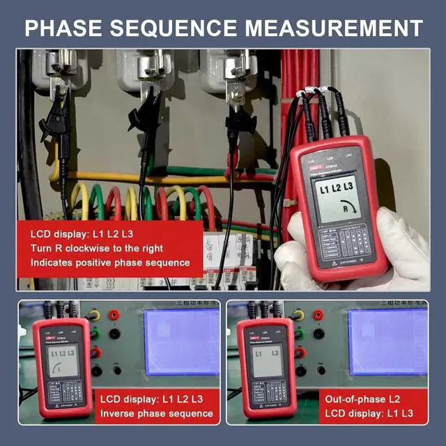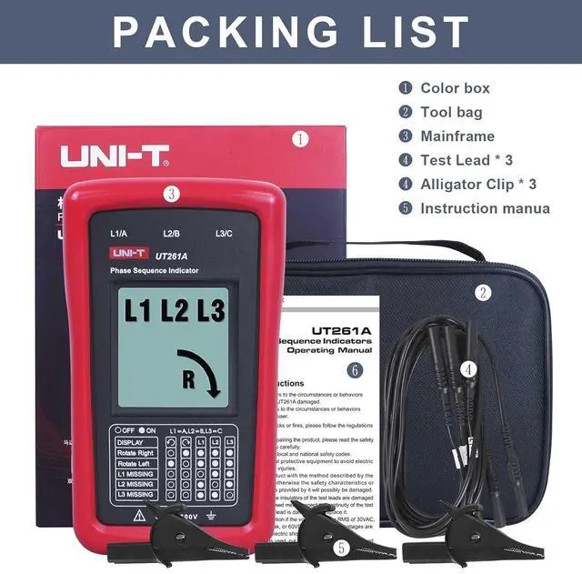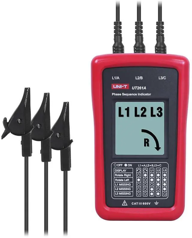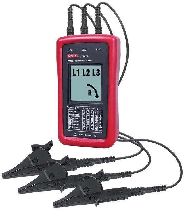 AC Phase Sequence TesterUT261A three-phase rotation meter is used to determine the three-phase power phase sequence, lack of phase indication. It can also perform resistance, capacitance, frequency measurements.