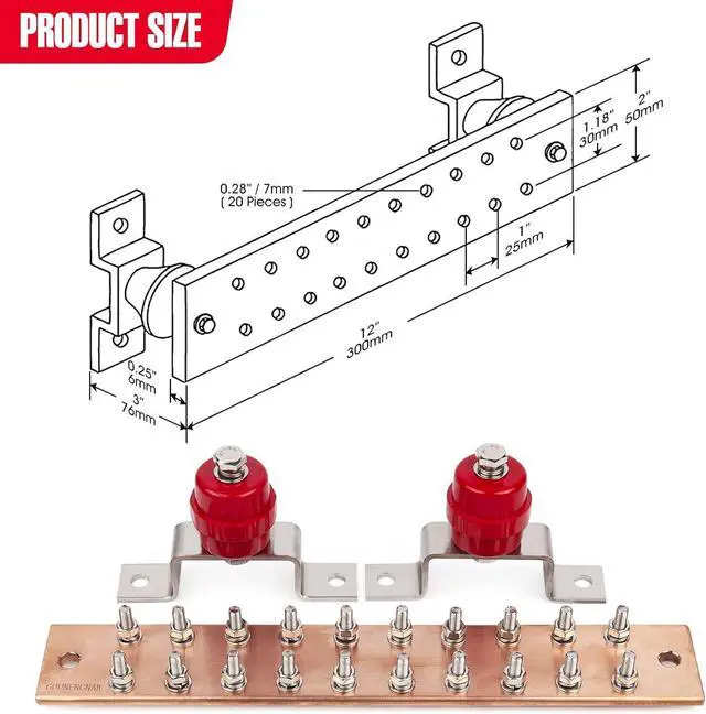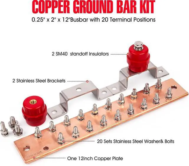 Copper ground bar set,including one 12inch copper plate, two SM40 standoff Insulators,two stainless steel brackets, 20 sets stainless steel washer& bolts.