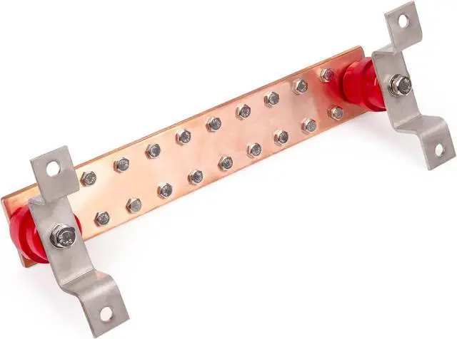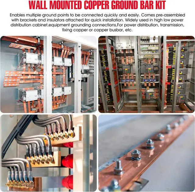 Wall mounted copper ground bar kit enables multiple ground points to be connected quickly and easily. Comes pre-assembled with brackets and insulators attached for quick installation. Widely used in high low power distribution cabinet,equipment grounding connections,For power distribution, transmission, fixing copper or copper busbar, etc.