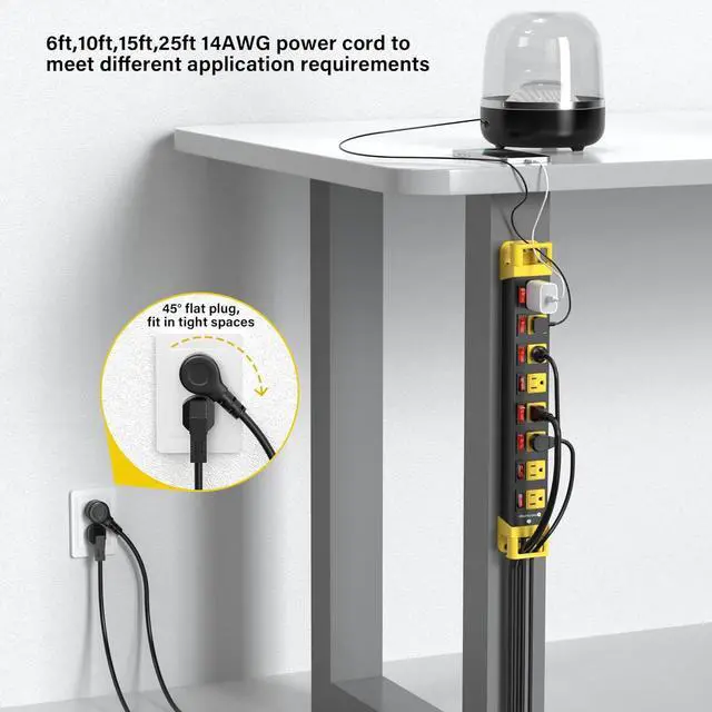This mountable power strip is crafted from 1.5mm extra thick aluminum alloy housing and reinforced plastic covering, offers strong wear resistance, fire protection and impact prevention. It's strong enough to handle tough jobs in garage, workshop, office, home, garden, school, etc. The 14AWG SJT grade wire supports power up to 1875W and better corrosion and oil resistance.