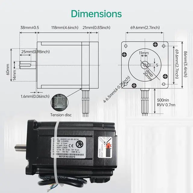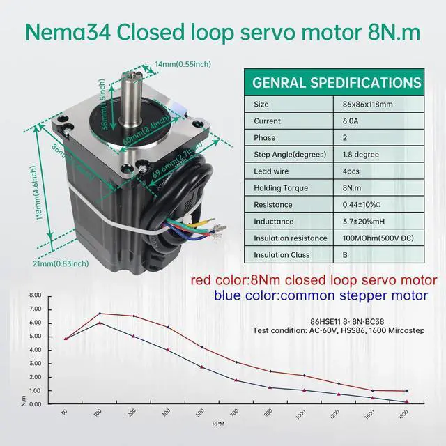 Specifications of Motor: Model is 86HSE118; Holding Torque:8N.m 1230oz-in; Rated Current:6A; Peak Current:8A; Phase:2-Phase; Size:86x86x118mm; Step Angle:1.8 degree; Motor Lead Wire: 4-Wires; Encoder lines:1000; Shaft diameter: 14mm