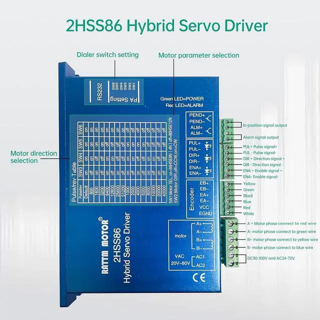 Specifications of Driver: Model is 2HSS86; Type:2-Phase Hybrid Stepper Servo Driver; Frequency:0-200KHz; Insulation resistance:>=500M; Voltage: AC 24-70V or DC 30-100V input