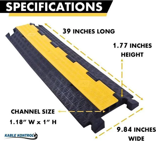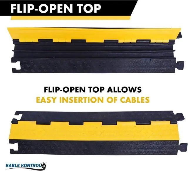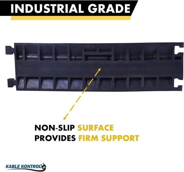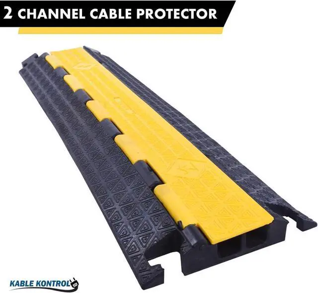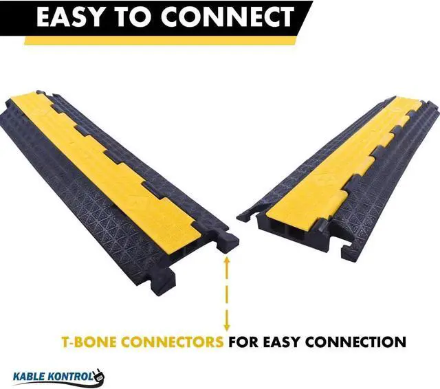 Kable Kontrol Atlas Cable Protectors are the ultimate solution for safeguarding your cables in high-traffic and industrial environments. Engineered for durability, these cable protectors feature a heavy-duty design that can withstand up to 24,000 lbs of weight, ensuring reliable protection even under the heaviest loads. Available in 2-channel, 3-channel, and 5-channel configurations, they provide versatile cable management options for various setups. The innovative T-bone shape connectors allow for easy extension, connecting multiple units to customize the length of your cable protection. With a flip-open top, placing and adjusting cables is effortless, offering hassle-free access whenever needed. The non-slip surface provides firm support, keeping cables securely in place, even in busy spaces. Available in multiple pack quantities, our floor cord covers meet the needs of both small and large-scale projects. Invest in these industrial-grade protectors for ultimate safety, durability, and organization of your cables. The recommended operating temperature range is -40º to +130. Atlas Rubber cable covers are designed and manufactured according to the guidelines provided by MUTCD, OSHA, RoHS, REACH. For maximum functionality, the rubber cable protectors have been treated for temperature resistivity and UV-stabilization.