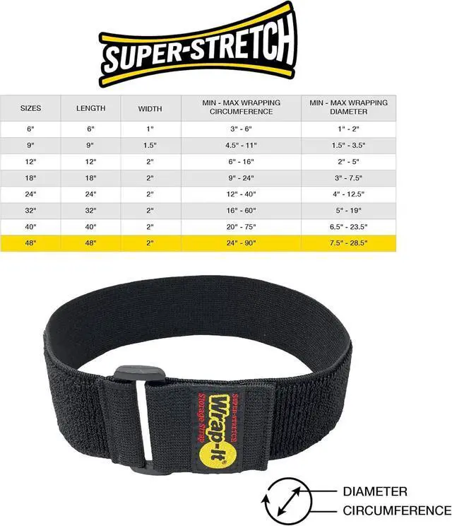 Super-Stretch Wrap-It Storage Straps are a super flexible way to get organized. Made with super-stretch elastic hook and loop so these cinch straps can wrap tight and secure! Quick and easy to use, simply wrap and store extension cords, air hoses, corded tools, audio cables, water and garden hoses, air hoses, pool hoses, vacuum hoses, ski rope, tow rope, dock line and so much more! Use Super-Stretch Wrap-It Storage Straps to get untangled and organized in the garage, workshop, shed, car, truck, boat, RV or around the house. WRAPS TIGHT: Made with elastic hook and loop allowing you to tightly wrap up and bundle items for clutter-free storage and organization. These elastic cinch straps stretch up to 1.5x the length for extra adjustability and snug hold.MULTI-PURPOSE: Use these storage straps as an extension cord organizer, cord wrap, cord keeper, hose strap and cable straps; or for hose storage, cord storage, garage storage and organization, and RV storage solutions; and even as bike straps, securing straps, luggage straps and more! The uses are endless. WEATHERPROOF, DURABLE and HIGH-QUALITY: Use indoors or outdoors, these nylon hook and loop straps are built to last! At Wrap-It Storage, we stand behind the quality of all our products. GREAT GIFT: These Super-Stretch Wrap-It Storage Straps make for a great practical gift for home owners, DIYers, tradespeople, RV and camping enthusiasts, boating enthusiasts, Father's Day, and birthdays for men.Customer favorite uses for these straps: extension cord organizer, cord storage, cord wrap, power cord organizer, cord keeper, cable straps, garden hose organizer, rope cinch strap, marine strap, air hose organizer, RV water hose storage, RV storage solutions, garage organizer, bike wheel strap, bike strap for rack.