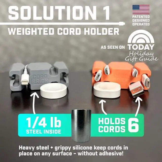 NEVER DROP CORDS: Use CordBrick to prevent falling cords on a nightstand, desk or counter. A steel weight inside adds heft and silicone outside adds grip.