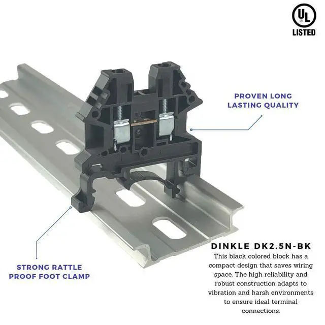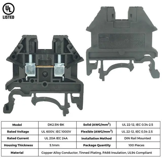 Dinkle DK2.5N-BK black color block has a compact design that saves wiring space. The high reliability and robust design adapts vibration and harsh thermal variation to prevent terminal connection fault. Rated voltage: UL 600V, IEC 1,000 V. Rated current: UL 20A, IEC 24A. Conductor cross-section, solid(AWG/mm2): UL 22-12, IEC 0.5-2.5. Conductor cross-section, flexible(AWG/mm2): UL 22-12, IEC 0.5-2.5. Rated impulse withstand voltage: 6KV. Torque(N-m): 0.4. Screw: M2.5. Wire strip length: 9-11mm. Insulating material: PA. T x H x W(mm): 5.1 x 39.6 x 40.5. End cover DK4NC-BK. Partition DKNSPS-005. Jumper DSS2.5N-02P, DSS2.5N-10P. Marking label TM08W, TM26W.
